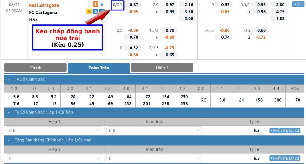 - Real Zaragoza hòa trước FC Cartagena(0-0, 11, 2-2,…). Thua ½ cược, người chơi mất một nửa số tiền đặt cược. Mất 50 nghìn và hoàn lại 50 nghìn.