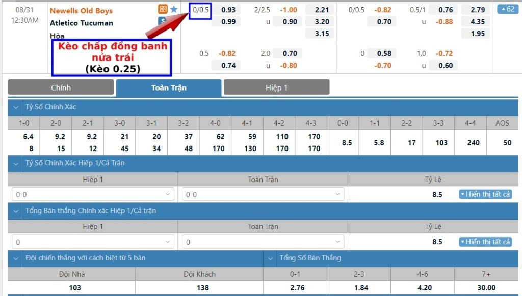 - Atletico Tucuman hòa trước Newells Old Boys. Thắng ½ kèo cược, người chơi được số tiền là 100×0.99/2= 49.5 nghìn. Nhận về 100 nghìn đặt cược và 49.5 nghìn lợi nhuận.