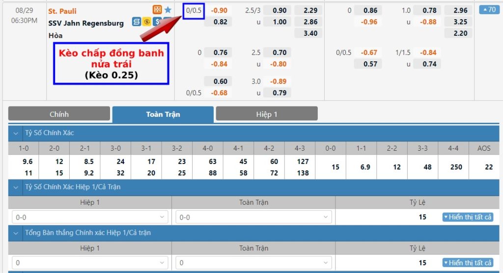 - St. Pauli hòa SSV Jahn Regensburg. Thua ½ cược, người chơi mất một nửa số tiền đặt cược, cụ thể: 100 x(-0.90)/2= 45 nghìn.