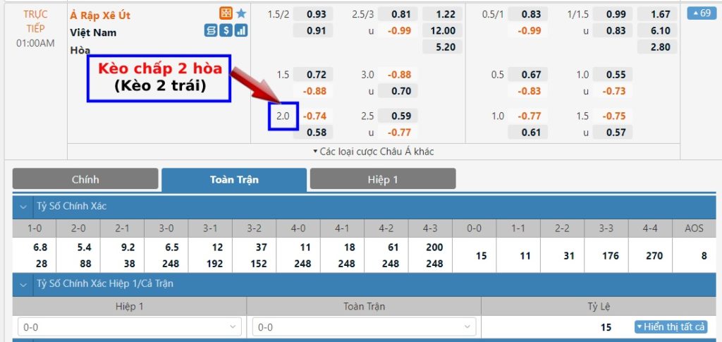 • Việt Nam thua trận với cách biệt 2 bàn trước Ả Rập Xê Út. Hòa kèo, người chơi được hoàn lại tiền đã cược.