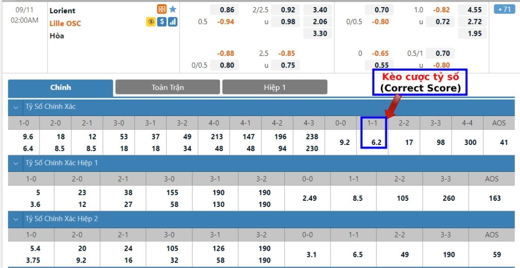 Lorient vs Lille OSC ở Ligue 1. Người chơi sau khi theo dõi và phân tích bảng kèo tỷ số chính xác, chọn cửa tỷ số chung cuộc Lorient vs Lille OSC là 1-1, đặt cược 100$ với tỷ lệ ăn kèo là 6.2. Sau khi trận đấu kết thúc có 2 tình huống có thể xảy ra: