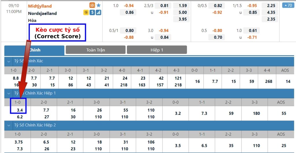 Midtjylland vs Nordsjaelland ở giải VĐQG Đan Mạch. Người chơi sau khi theo dõi và phân tích bảng kèo tỷ số chính xác, chọn cửa tỷ số hiệp 1 Midtjylland vs Nordsjaelland là 1-0, đặt cược 100$ với tỷ lệ ăn kèo là 3.4 Sau hiệp 1 kết thúc có 2 tình huống có thể xảy ra: