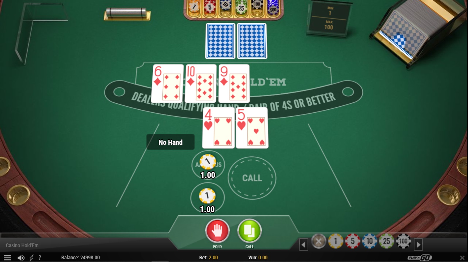 Trong game Casino Hold’em của Play’n Go tại nhà cái Oxbet, bạn sẽ được chơi với bộ bài 52 lá tiêu chuẩn. Nhìn chung thì cách chơi cũng giống như Poker bình thường thôi, nếu biết chơi Poker rồi thì thoải mái.