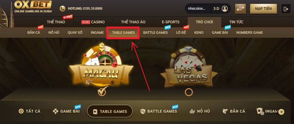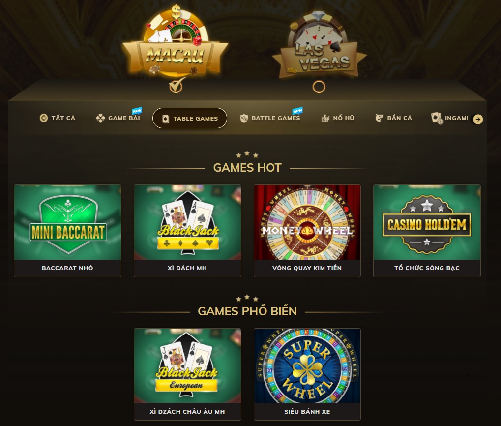 • Bước 3: Chọn danh mục “Table Games” ở ngay phía trên trang chủ. Lúc này sẽ có 2 khu vực là Macau và Las Vegas hiện ra, lựa chọn Macau.