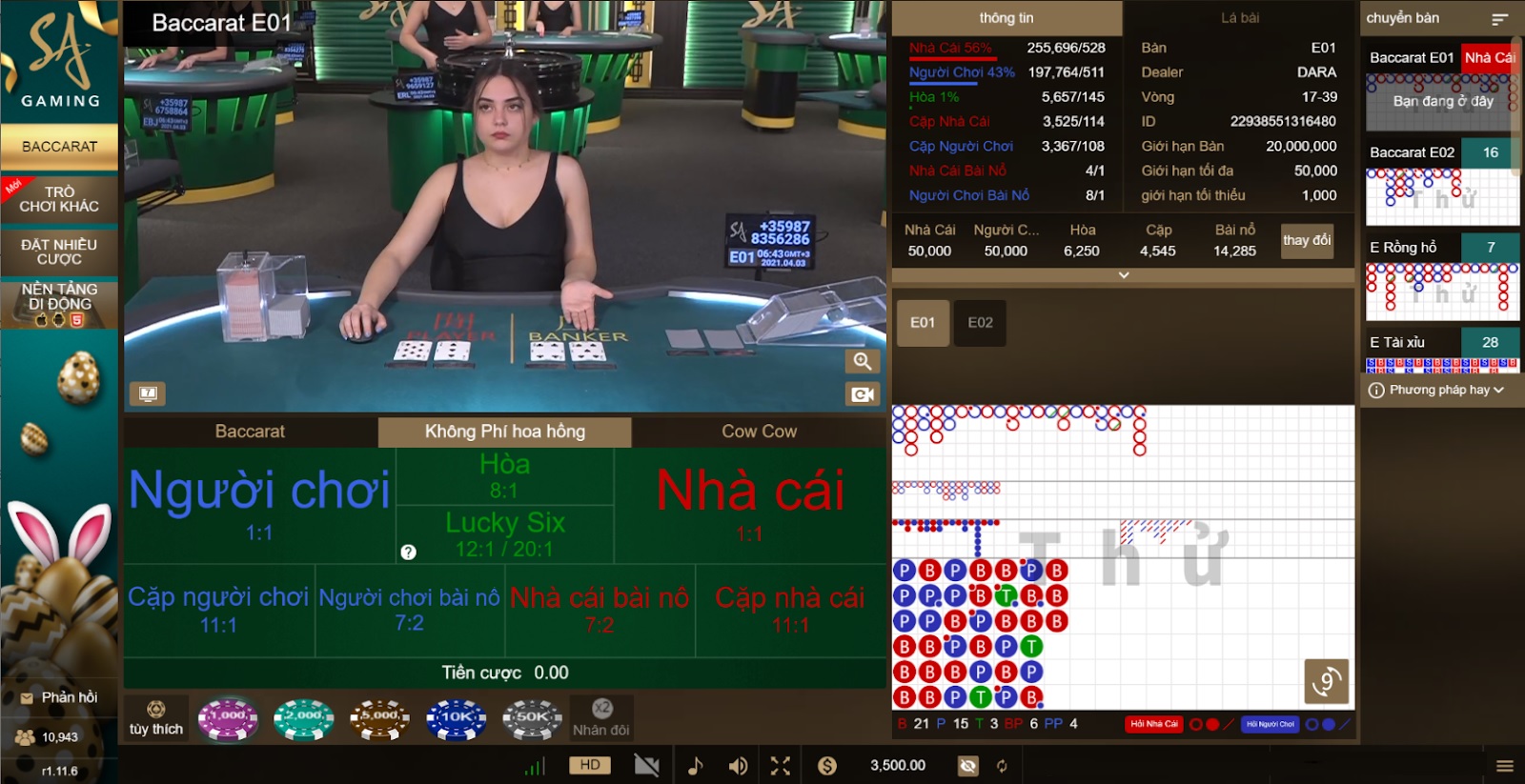Trong game No Commission Baccarat của SA Gaming thì bạn sẽ đối đầu trực tiếp với nhà cái trả thưởng xanh chín 1:1 luôn, đặt 100K là ăn 100K không cắt phế. Nếu bạn đặt cược vào cửa Nhà cái thì có thể nhận lại tiền cược của mình khi kết quả Hòa.