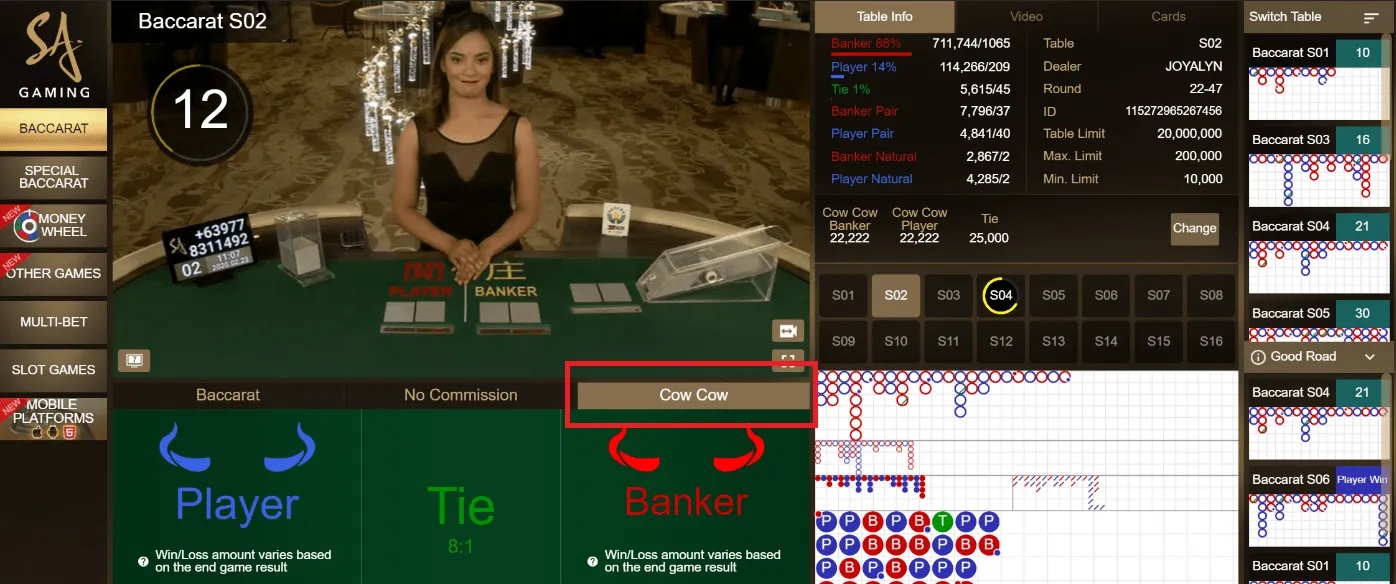 Cow Cow Baccarat là một game kết hợp giữa Baccarat và Cow Cow – một trò chơi poker nổi tiếng tại các Casino châu Á. Trò chơi này của SA Gaming mang đến sự hồi hộp và căng thẳng cho người chơi vì tỷ lệ cược có thể lên tới 9:1, kết quả chỉ ngã ngũ khi lá bài cuối cùng được Dealer mở ra.