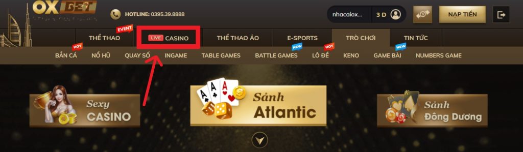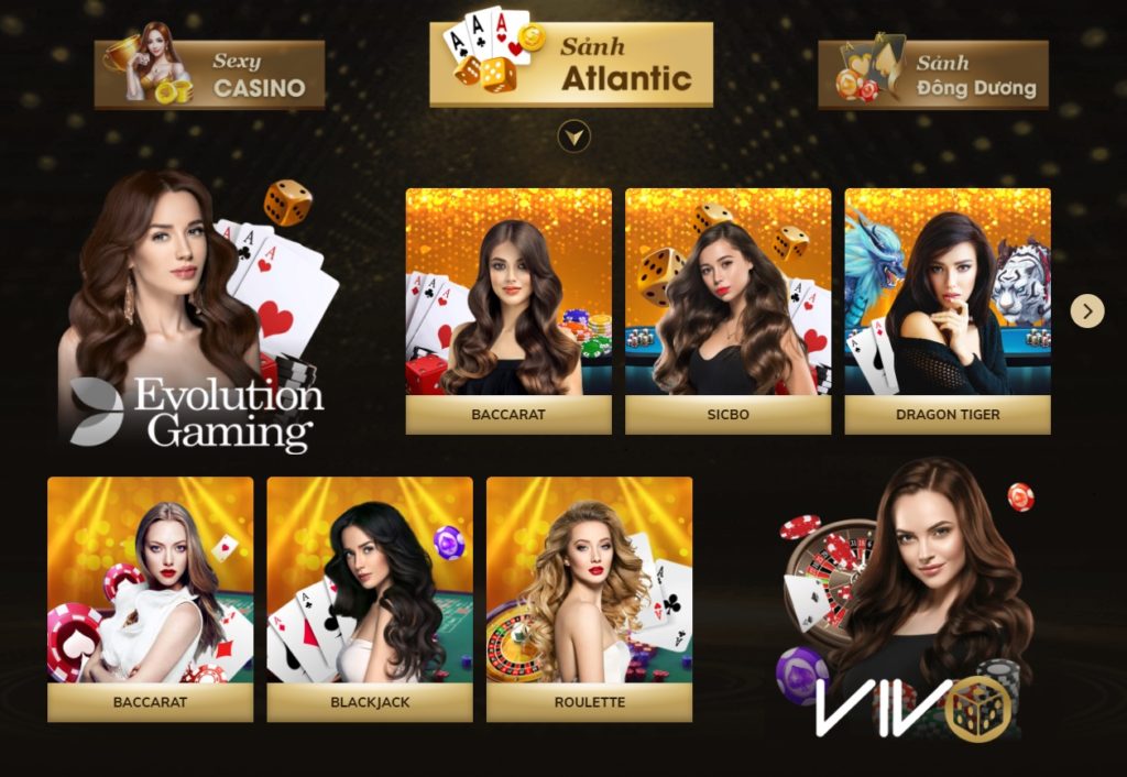 - Bước 3: Chọn “Live Casino” ở ngay phía trên trang chủ. Lúc này sẽ có 3 sảnh Casino online hiện ra. Vivo Gaming nằm ở sảnh Atlantic.